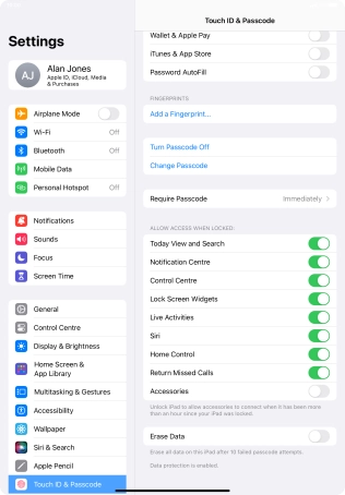 Press the indicator next to "Erase Data" to turn the function on or off.