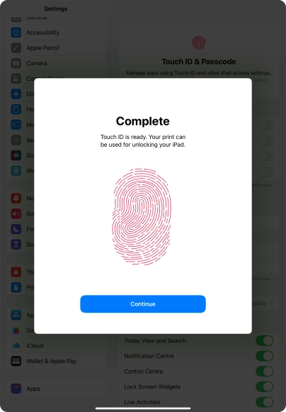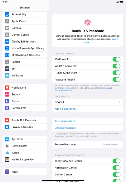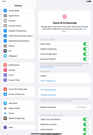 You can set your tablet to use your fingerprint as lock code or to authorise iTunes and App Store purchases. To use Touch ID, you need to turn on the lock code.