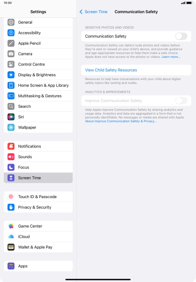 Communication Safety detects sensitive content in pictures and videos sent from and received on the selected Apple devices and offers guidance and warnings about this. This feature can be used when setting up Screen Time for your family group.