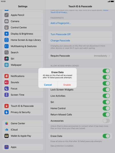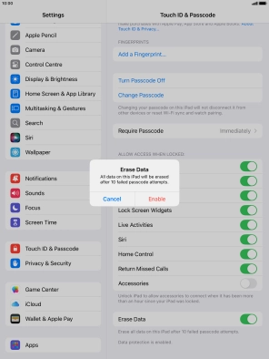 Press the indicator next to "Erase Data" to turn the function on or off.