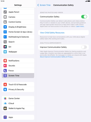 Communication Safety detects sensitive content in pictures and videos sent from and received on the selected Apple devices and offers guidance and warnings about this. This feature can be used when setting up Screen Time for your family group.