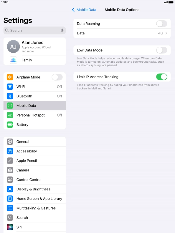 Press the indicator next to "Data Roaming" to turn the function on or off.
