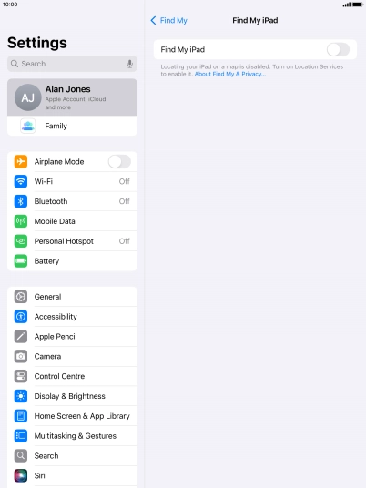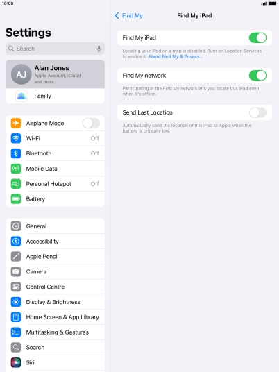 Find My iPad enables you to find your tablet if you lose it or you can lock it should it get stolen. To select settings for Find My iPad, you need to activate your Apple ID on your tablet.