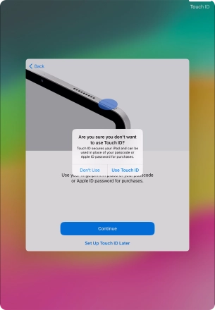 Follow the instructions on the screen to turn on use of Touch ID or press Set Up Touch ID Later.