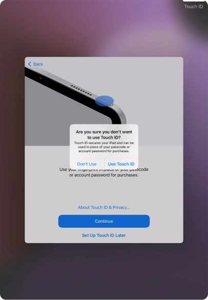 Follow the instructions on the screen to turn on use of Touch ID or press Set Up Touch ID Later.