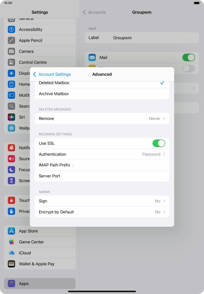 Press the required email account and follow the instructions on the screen to select settings for the specific account.