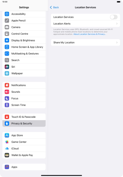 Press the indicator next to "Location Services" to turn the function on or off.