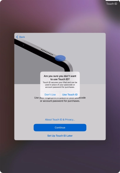 Follow the instructions on the screen to turn on use of Touch ID or press Set Up Touch ID Later.