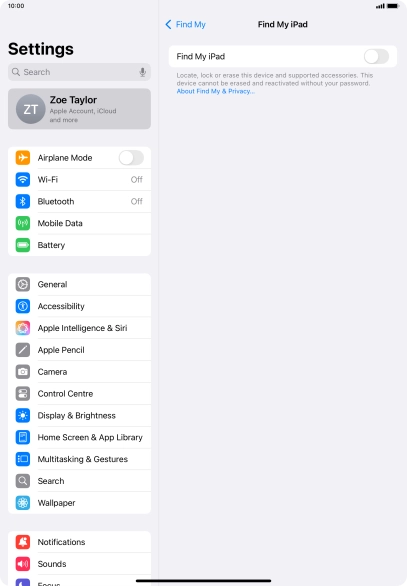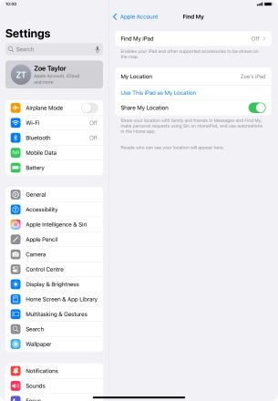 Find My iPad enables you to find your tablet if you lose it or you can lock it should it get stolen. To select settings for Find My iPad, you need to activate your Apple ID on your tablet.