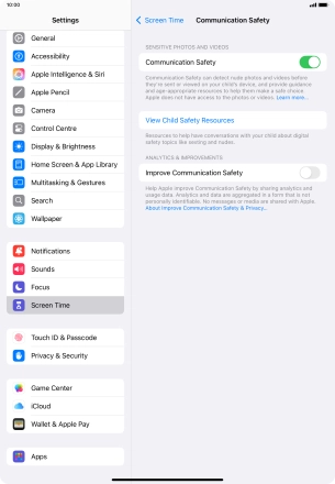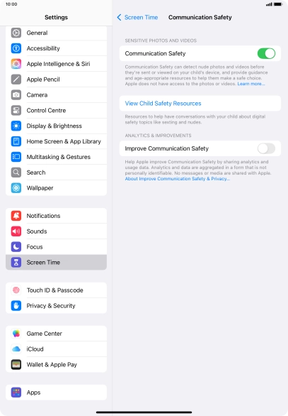 Communication Safety detects sensitive content in pictures and videos sent from and received on the selected Apple devices and offers guidance and warnings about this. This feature can be used when setting up Screen Time for your family group.