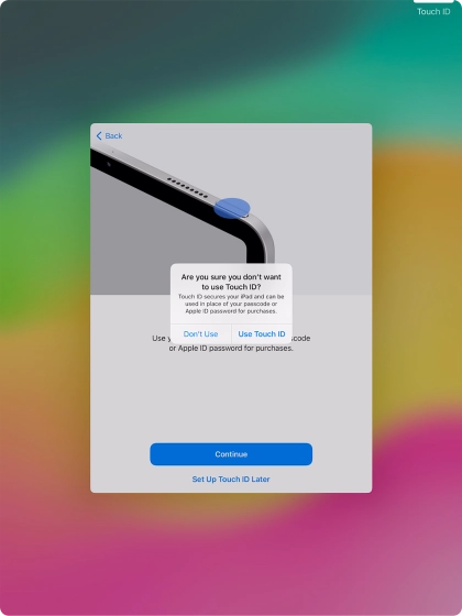 Follow the instructions on the screen to turn on use of Touch ID or press Set Up Touch ID Later.