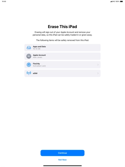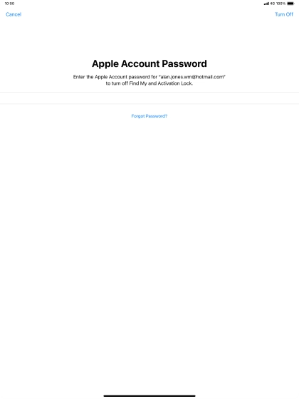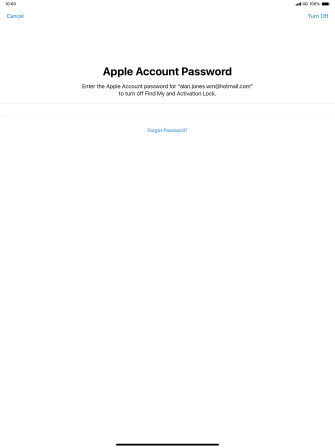 Key in the password for your Apple ID and press Turn Off. Wait a moment while the factory default settings are restored. Follow the instructions on the screen to set up your tablet and prepare it for use.
