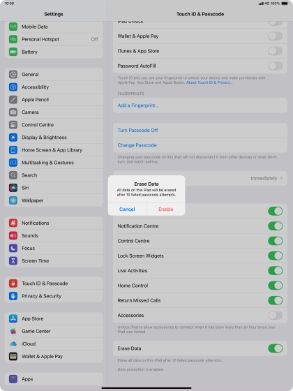 Press the indicator next to "Erase Data" to turn the function on or off.
