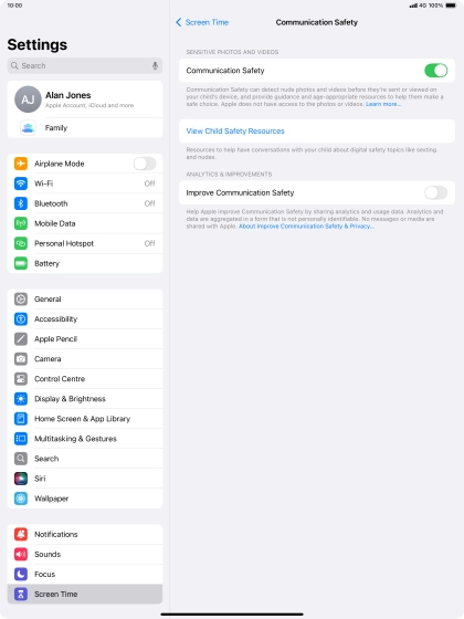 Communication Safety detects sensitive content in pictures and videos sent from and received on the selected Apple devices and offers guidance and warnings about this. This feature can be used when setting up Screen Time for your family group.