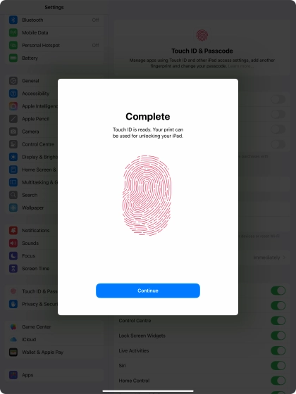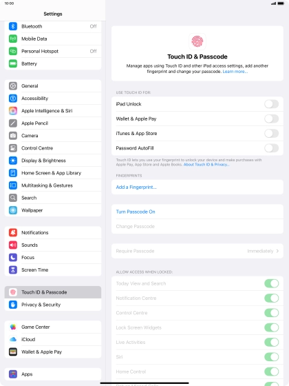 You can set your tablet to use your fingerprint as lock code or to authorise iTunes and App Store purchases. To use Touch ID, you need to turn on the lock code.