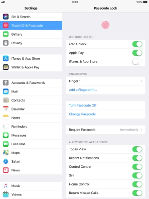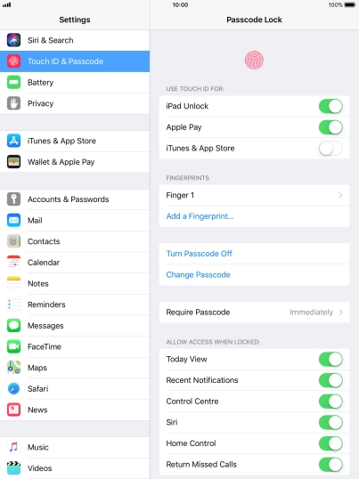 You can set your tablet to use your fingerprint as lock code or to authorise iTunes and App Store purchases. To use Touch ID, you need to turn on the lock code.