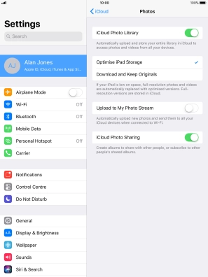 You can synchronise the contents of your tablet using iCloud enabling you to access the contents from different devices or restore them if you lose your tablet. To use iCloud, you need to activate your Apple ID.