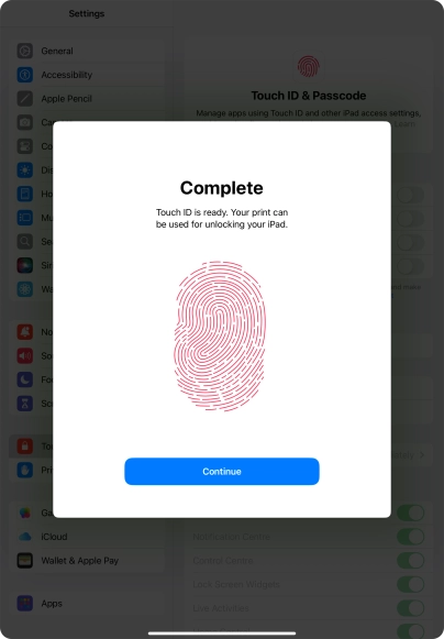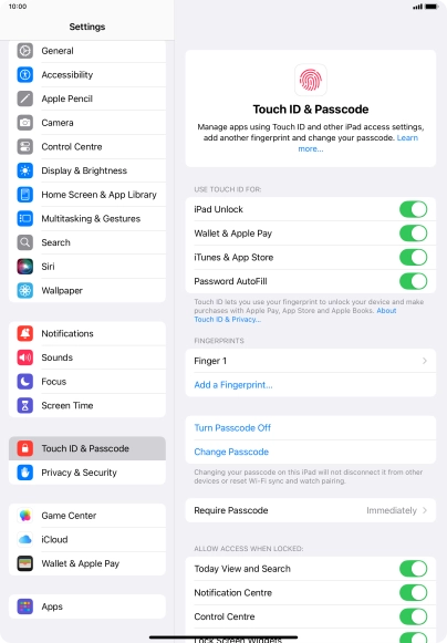 You can set your tablet to use your fingerprint as lock code or to authorise iTunes and App Store purchases. To use Touch ID, you need to turn on the lock code.