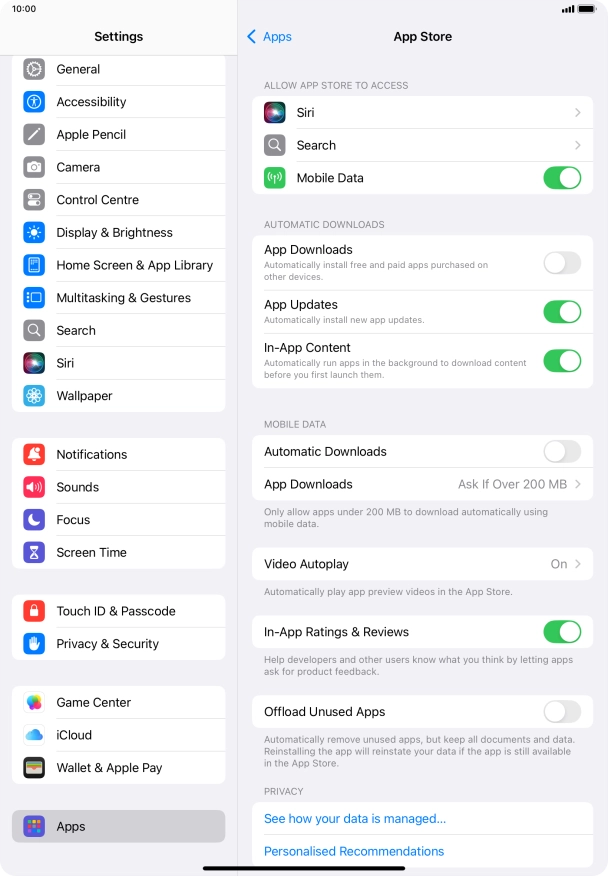 Press the indicator next to "App Downloads" to turn the function on or off.