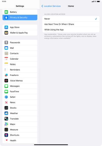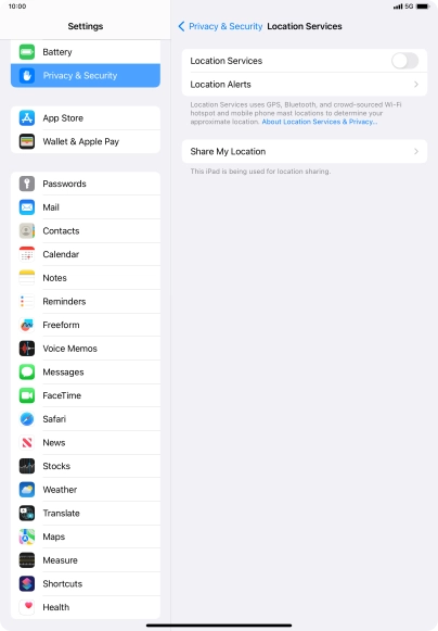 Press the indicator next to "Location Services" to turn the function on or off.