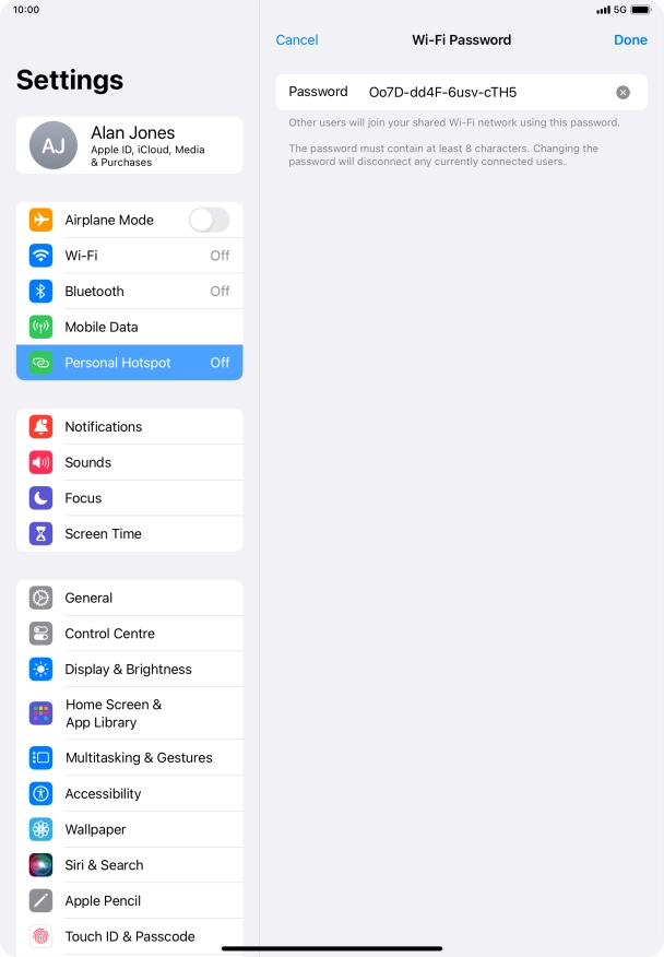 Key in the password for personal hotspot