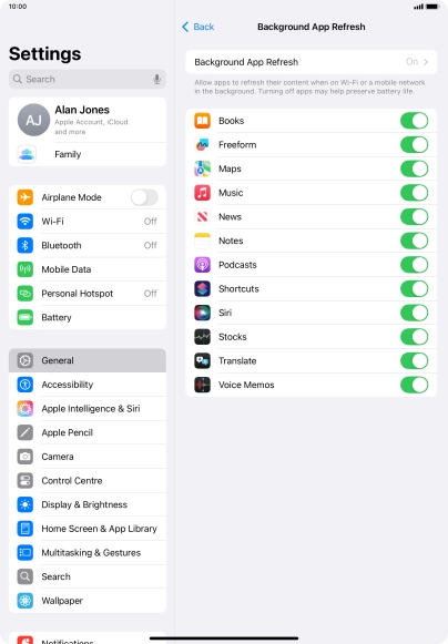 To turn off background refresh of apps, press Off.