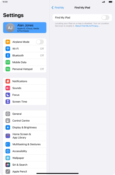 Find My iPad enables you to find your tablet if you lose it or you can lock it should it get stolen. To select settings for Find My iPad, you need to activate your Apple ID on your tablet.