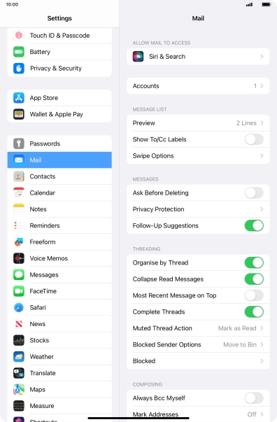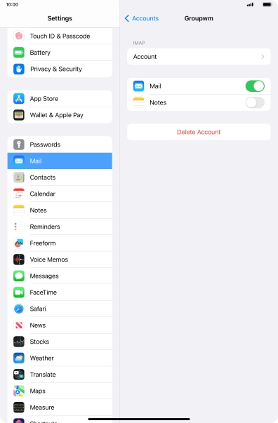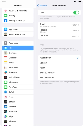 Press the required email account and follow the instructions on the screen to select settings for the specific account.