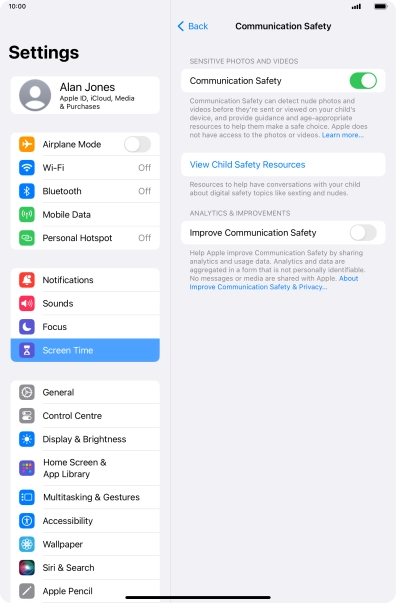 Communication Safety detects sensitive content in pictures and videos sent from and received on the selected Apple devices and offers guidance and warnings about this. This feature can be used when setting up Screen Time for your family group.