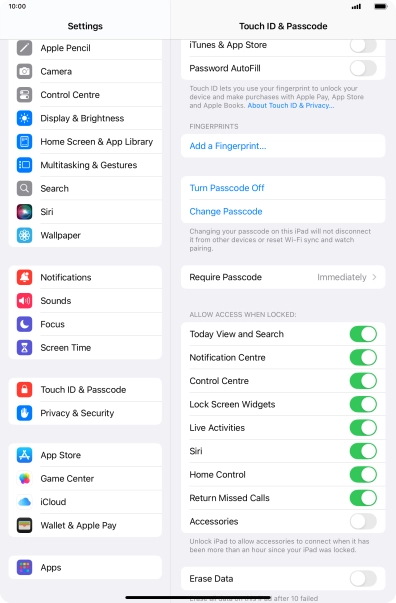 Press the indicator next to "Erase Data" to turn the function on or off.