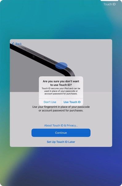 Follow the instructions on the screen to turn on use of Touch ID or press Set Up Touch ID Later.