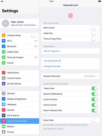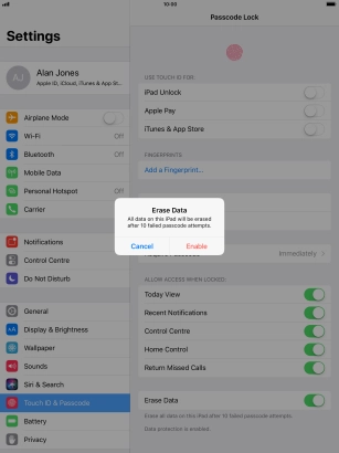 Press the indicator next to "Erase Data" to turn the function on or off.