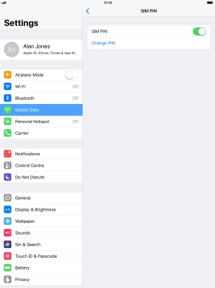 Press the indicator next to "SIM PIN" to turn the function on or off.