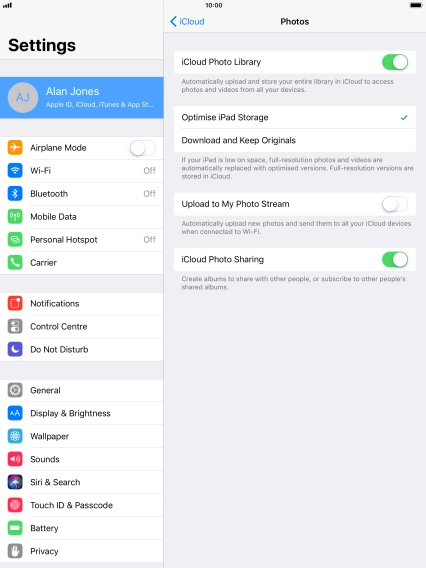 You can synchronise the contents of your tablet using iCloud enabling you to access the contents from different devices or restore them if you lose your tablet. To use iCloud, you need to activate your Apple ID.