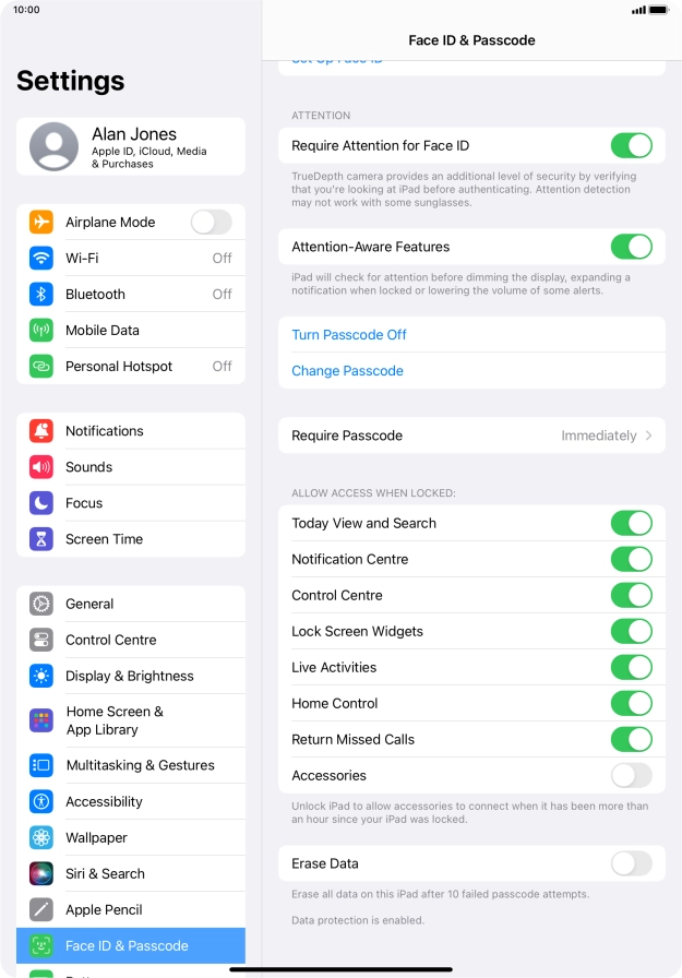 Press the indicator next to "Erase Data" to turn the function on or off.