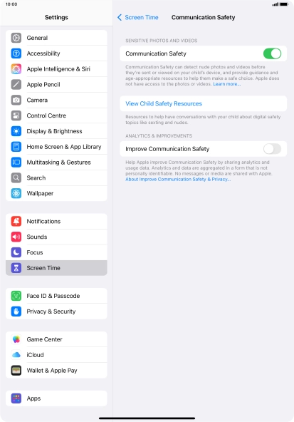 Communication Safety detects sensitive content in pictures and videos sent from and received on the selected Apple devices and offers guidance and warnings about this. This feature can be used when setting up Screen Time for your family group.