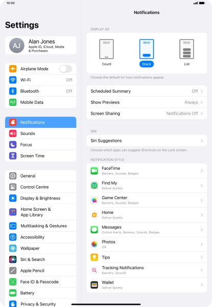 Press the indicator next to "Allow Notifications" to turn notifications for the selected application on or off.