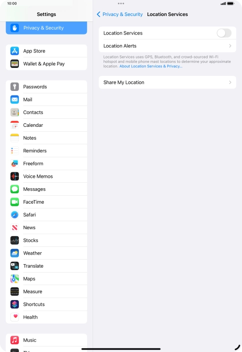 Press the indicator next to "Location Services" to turn the function on or off.