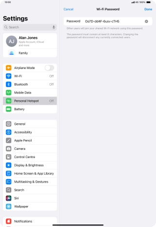 Key in the password for personal hotspot