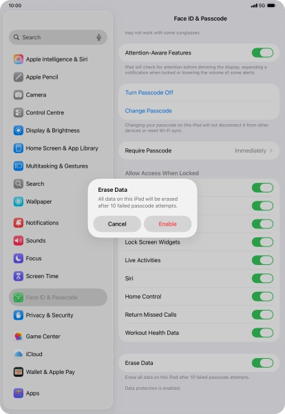 Press the indicator next to "Erase Data" to turn the function on or off.