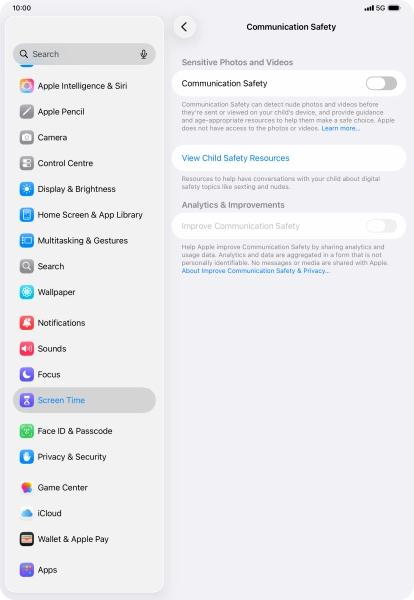 Communication Safety detects sensitive content in pictures and videos sent from and received on the selected Apple devices and offers guidance and warnings about this. This feature can be used when setting up Screen Time for your family group.