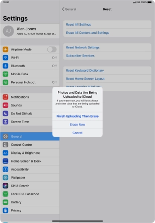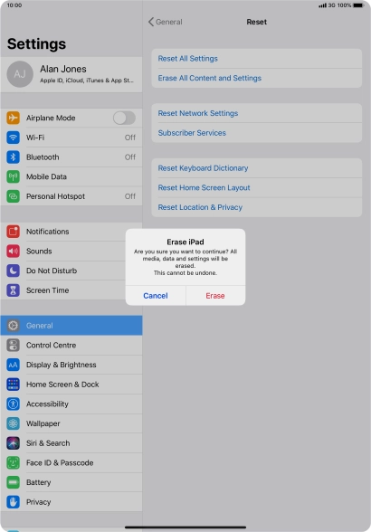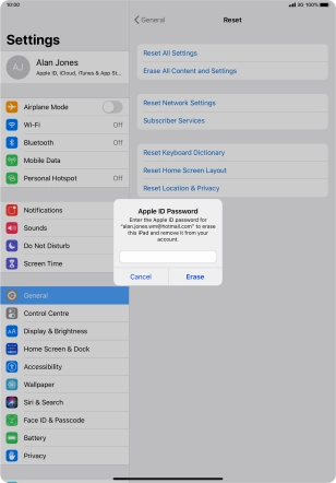 Key in the password for your Apple ID and press Erase. Wait a moment while the factory default settings are restored. Follow the instructions on the screen to set up your tablet and prepare it for use.
