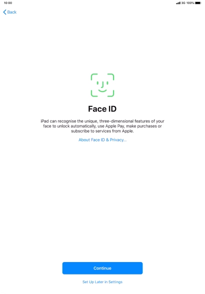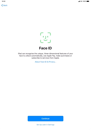 Follow the instructions on the screen to turn on use of Face ID or press Set Up Later in Settings.