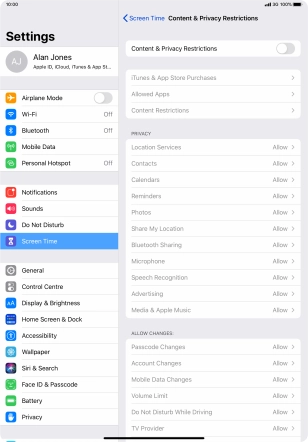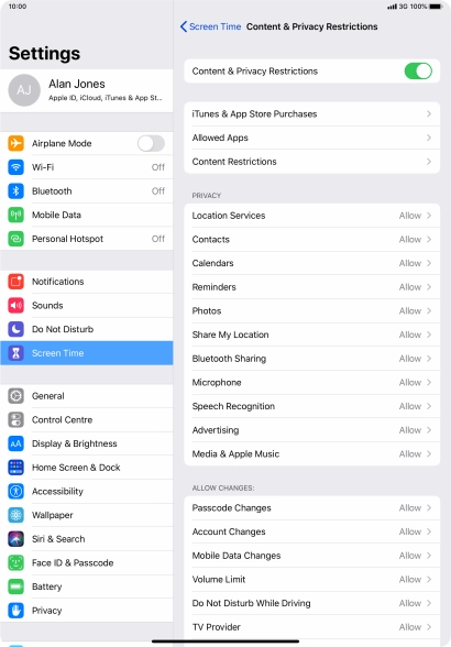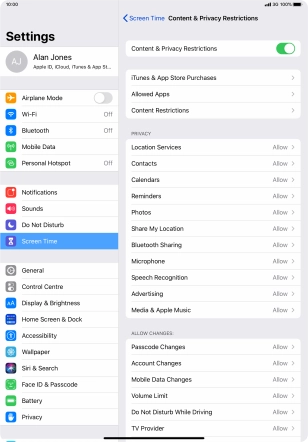 Press the indicator next to "Content & Privacy Restrictions" and follow the instructions on the screen to select settings for content and privacy restrictions.