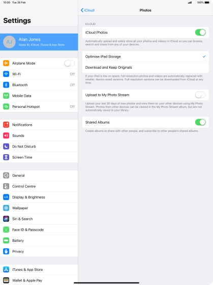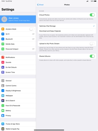 You can synchronise the contents of your tablet using iCloud enabling you to access the contents from different devices or restore them if you lose your tablet. To use iCloud, you need to activate your Apple ID.
