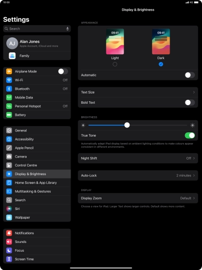 If you turn on the function, press Options and follow the instructions on the screen to select the required period of time for Dark Mode.