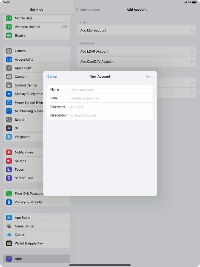Press Username and key in the username for your email account.