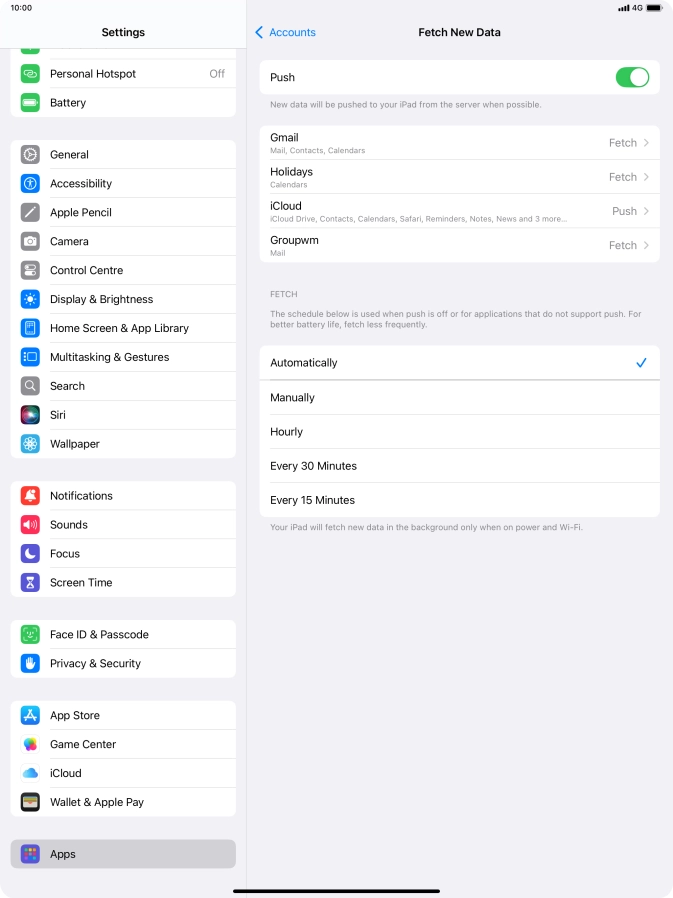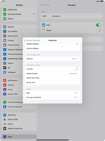 Press the required email account and follow the instructions on the screen to select settings for the specific account.