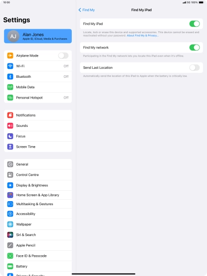 Select settings for Find My iPad