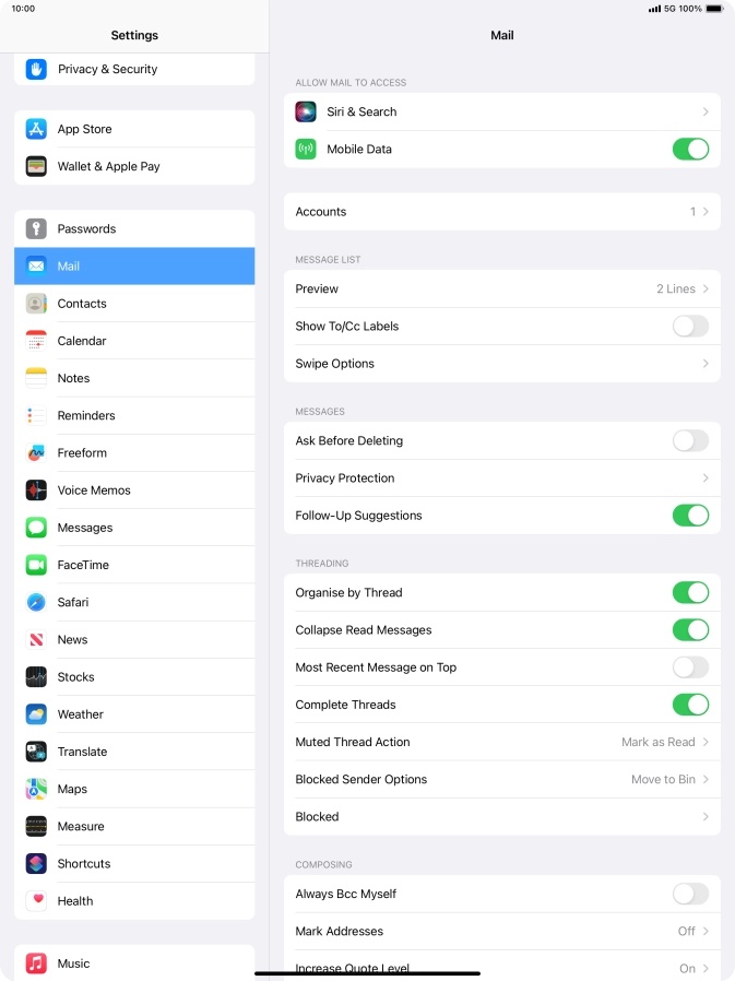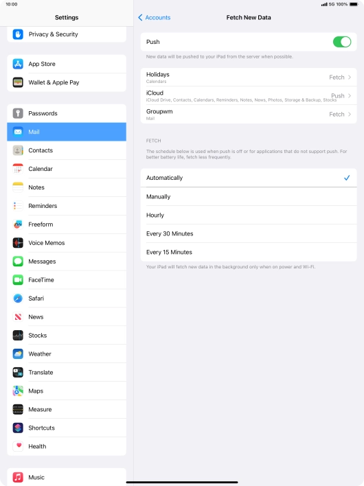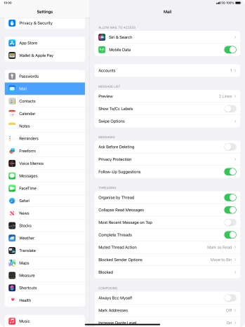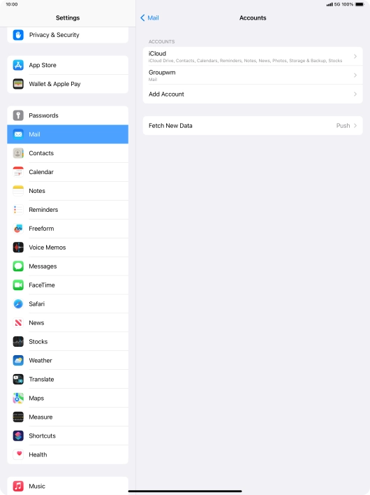 Press the required email account and follow the instructions on the screen to select settings for the specific account.